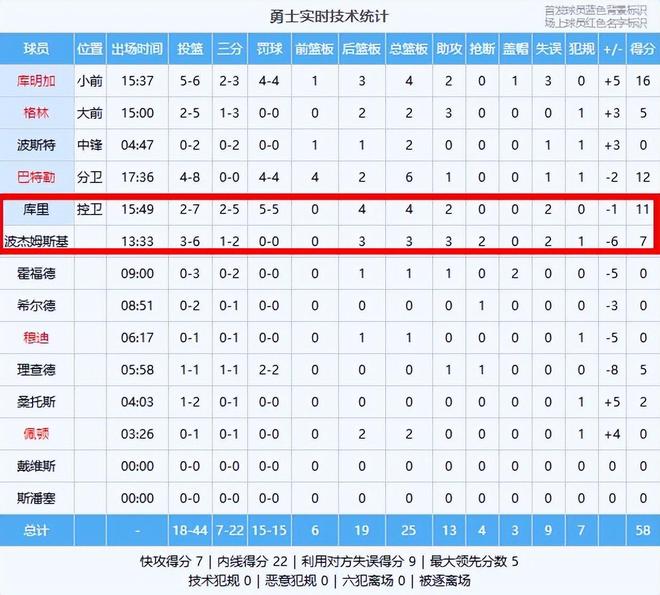 二号罪人(波杰姆斯基):6中3的1分3篮板3助攻2抢断,正负值-6!仅上半场比赛波杰姆斯基不知道出现多少次误攻了,糟糕的进攻选择,离谱的传球一样不缺,是勇士落后的二号罪人!