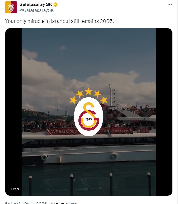 加拉塔萨雷在主场以1-0力克英超领头羊利物浦,这也爆出了一大冷门!在比赛结束后,加拉塔萨雷队在社媒上,也对利物浦进行调侃:“在伊斯坦布尔的比赛里,你们唯一的奇迹仍然是在2005年。”