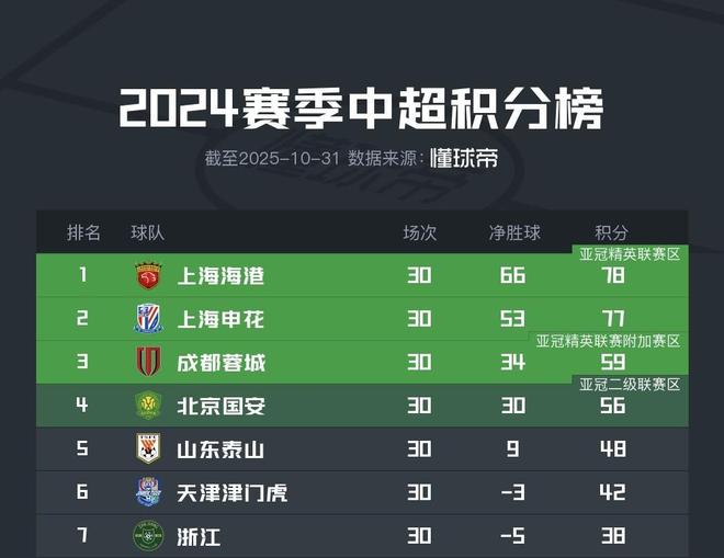北京时间10月31日,中超第29轮先结束了三场争冠关键战。结果上海双雄分别战胜了各自的对手,而成都因为不敌河南提前失去了争夺冠军的机会。有趣的是,这样结束的赛果导致目前中超积分榜前7与上赛季最终的前7完全一致。